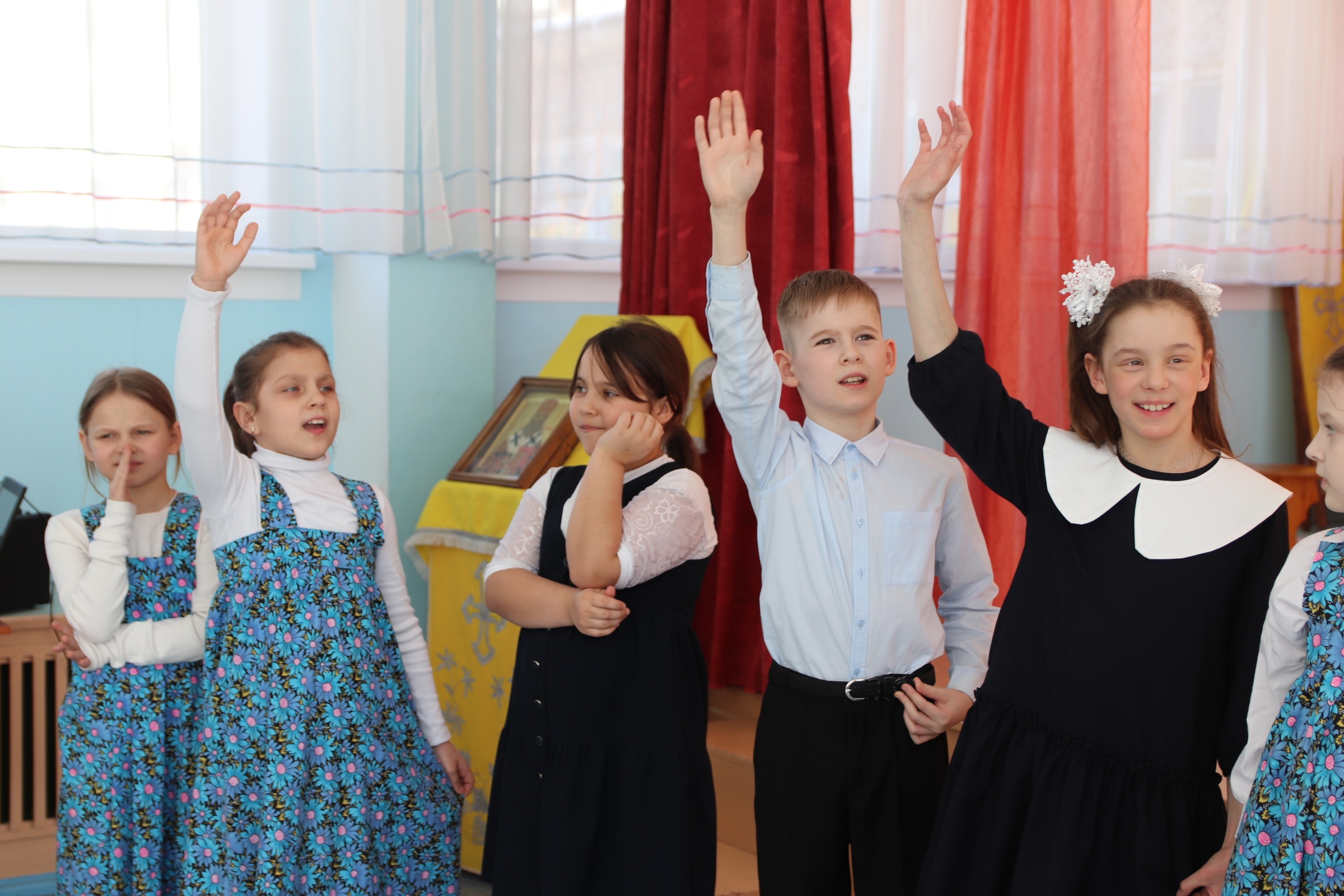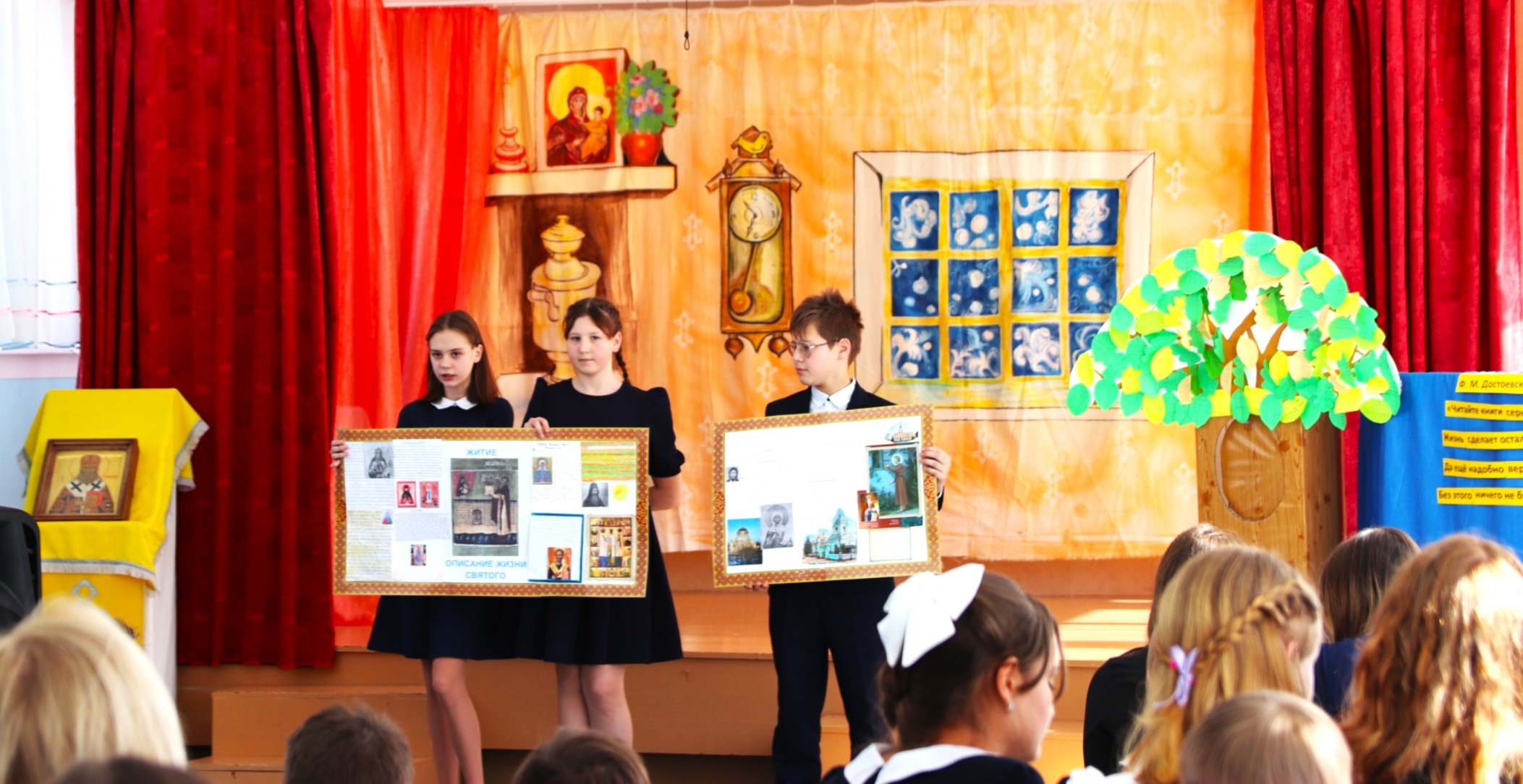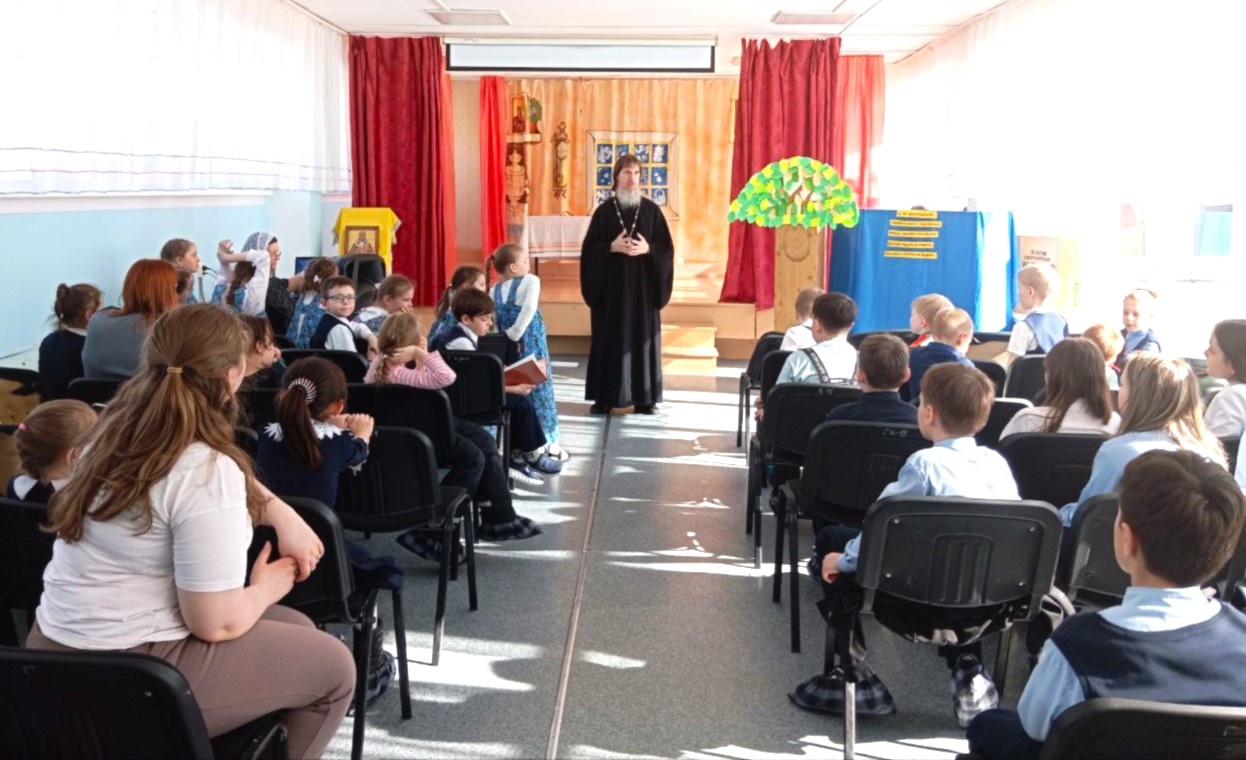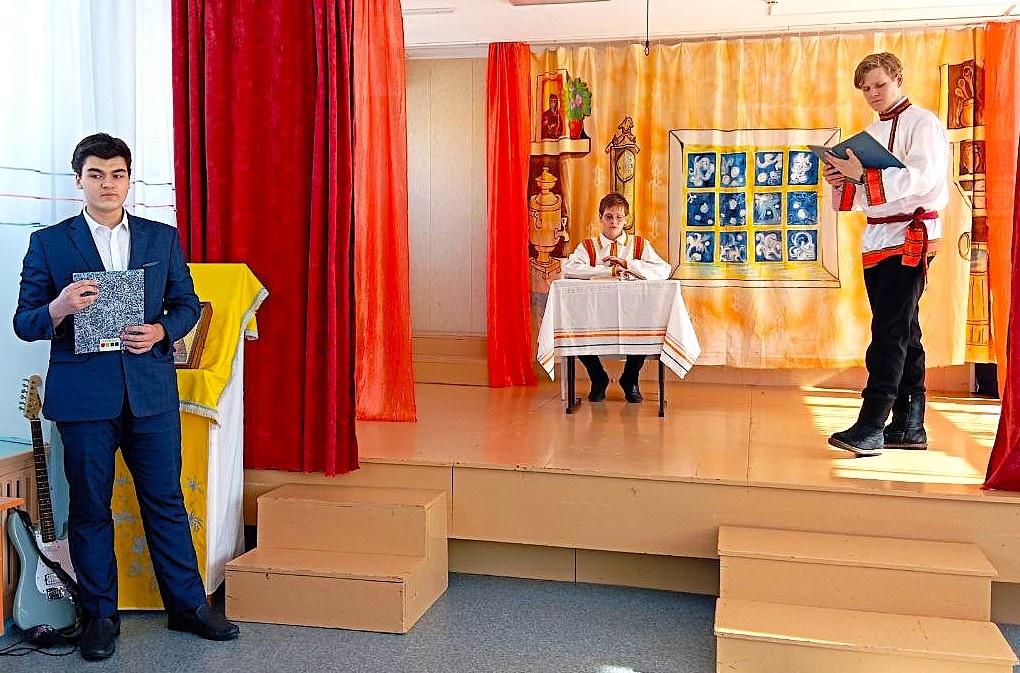 На празднике ребята из 2-го, 4-го, 5-го, 6-го и 7-го классов рассказали о произведениях, прочитанных ими на неделе Православной книги. А десятиклассники Олег Каюков и Матвей Сорокин вместе с шестиклассником Матвеем Паничевым представили сцену из рассказа православного писателя Василия Акимовича Никифорова-Волгина о красоте церковнославянского языка.